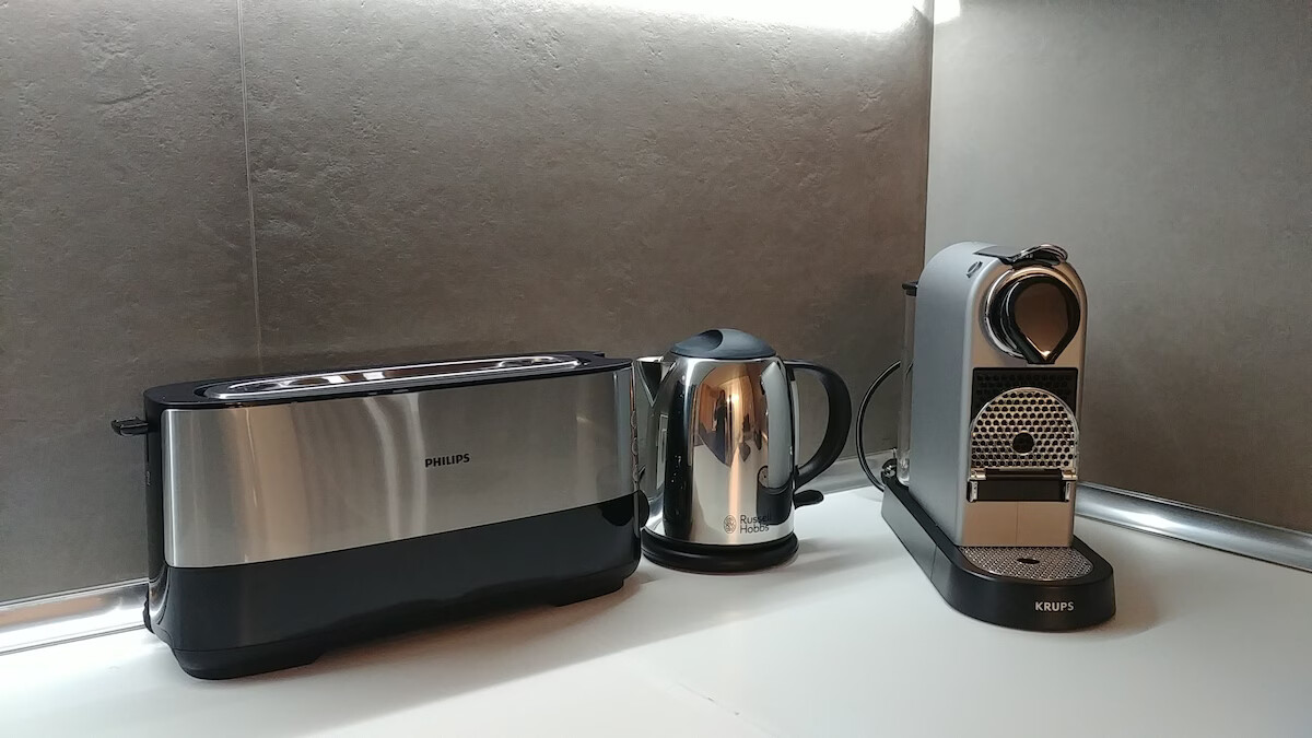 Cocina bien equipada con un juego completo de vajilla y utensilios de cocina, lavavajillas, horno, microondas, tostadora, batidora de mano, cafetera Nespresso y hervidor eléctrico.